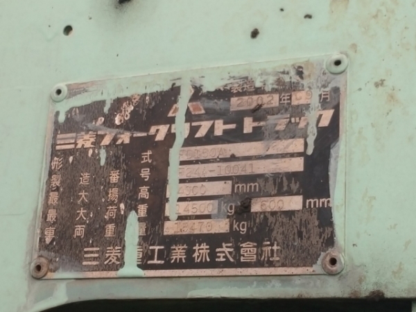 中古 15.0t フォークリフト ディーゼル メーカー:三菱 型式:FD150A 製番:F24A-10041 15.0ton, 4m-マスト 仕様 オートマティック・フォークシフト フォーク:2420mm Wタイヤ(エアー 2002年9月製 アワー:8290時間(写真よりも若干増えてます) 在庫地:大阪南港工場現状渡し 注意事項 ※運送時はマストを外さなければならない。 マスト解体費用は別途 お気軽にお問い合わせください。 |